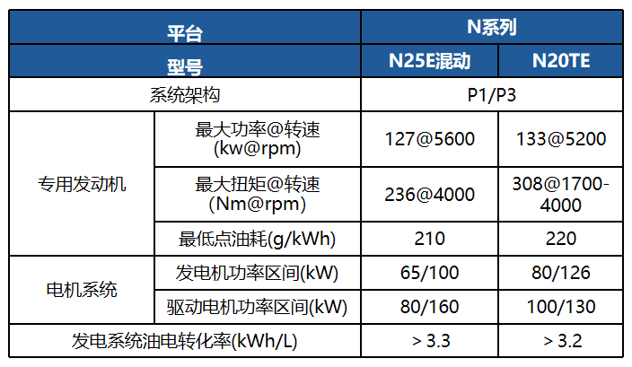基于N系列發(fā)動機開發(fā)的適配增程混動車型,最大輸出功率130kW;適用于B級轎車、中大型SUV、皮卡等車型。